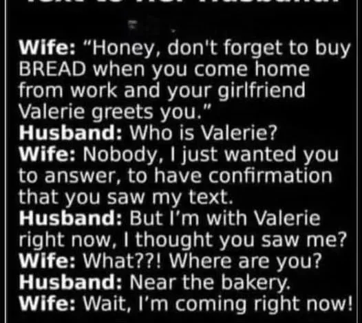 Wife: “Honey, don’t forget to buy BREAD when you come home from work and your girlfriend Valerie greets you.” Husband: “Who is Valerie?” Wife: “Nobody, I just wanted you to answer, to have confirmation that you saw my text.” Husband: “But I’m with Valerie right now,