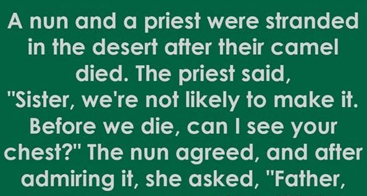 A nun and a priest found themselves stranded in the desert after their camel passed away. The priest, sensing the gravity of the moment, looked at the nun and said, “Sister, it seems we may not survive this.” “Can I see your chest before we die?”