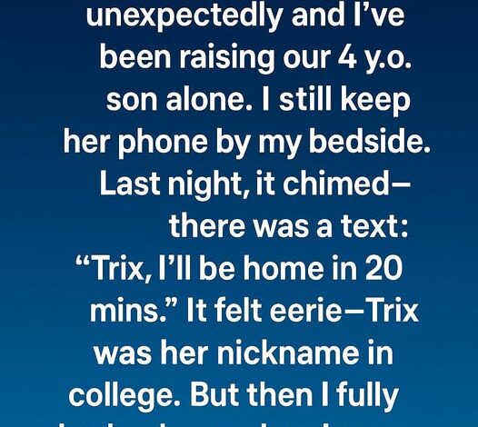 Until last night. A chime pierced the silence: “Trix, I’ll be home in 20 mins.” “Trix” was her private college nickname for me—no one else knew it. Heart pounding, hands shaking, I checked the thread, desperate for logic amid rising hope.