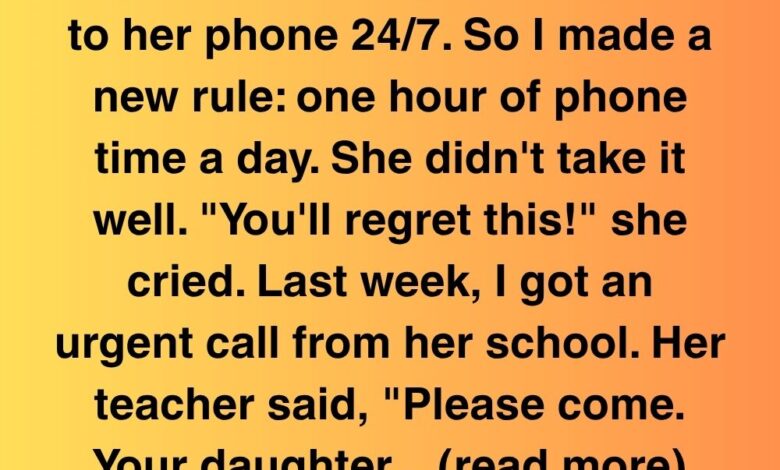 My 14-year-old daughter, Mina, was always on her phone, so I set a rule: one hour of phone time daily. She raged, “You’ll regret this!” Then her school called urgently. Her teacher, Ms. Jafari, sounded shaken, asking me to come in person. I feared Mina was in trouble—maybe caught texting in class again.