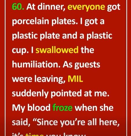 “I watched all evening,” she continued. “Everyone with porcelain plates… except her. And you said nothing.”