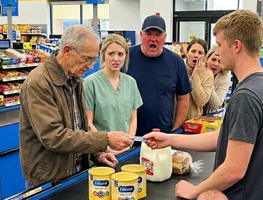 He tried again. She stood there in faded scrubs with a baby strapped into the cart seat, bouncing one shaking hand on the handle like she could keep herself from falling apart if she just kept moving. On the belt were three cans of formula, a gallon of milk, and a cheap box of cereal.