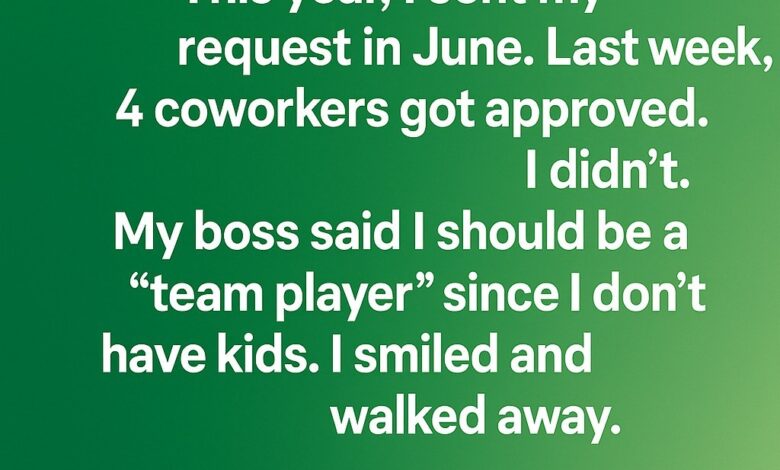 I reminded him of that, gently. I told him I respected the team, but fairness mattered. Approving time off for others while denying mine—because I didn’t have children—was not something I could keep accepting.