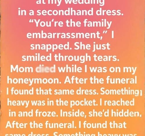 When I think back to my wedding day, the moment that echoes louder than the ceremony or the photographs is when my mother walked in wearing a thrift-store dress. A sudden, irrational embarrassment washed over me, and I let it control my tongue. I said things I can’t take back—careless remarks meant to impress others. She didn’t argue. She just smiled that small, tired smile of someone who has learned to carry pain quietly. I moved on with my day, unaware that those few seconds would become the memory that would haunt me.