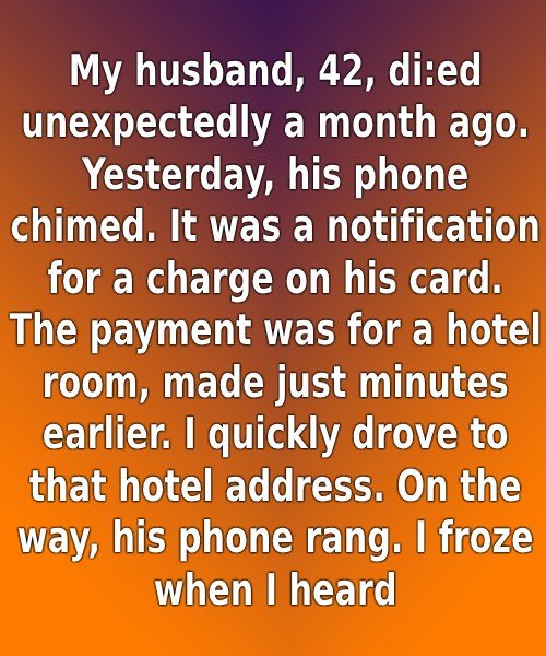 A month after my husband Alden, 42, died unexpectedly, his phone notified me of a hotel charge made minutes earlier. Shocked, I drove to the hotel. En route, his phone rang—caller ID showed “Marlon – Work,” his boss. Unable to answer, I arrived and learned he was in Room 403. No one answered my knocks. A teenage cleaner revealed Alden had been there recently with a blonde woman, despite being “dead.” His phone showed a search: “What happens if you fake your death?” I discovered a large life insurance payout to a joint account I didn’t open.