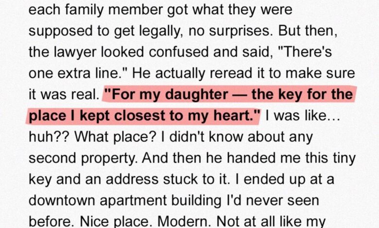 My dad passed away a few months ago, and settling his estate seemed straightforward. At the reading of his will, everyone received what they expected — no surprises. But then the lawyer hesitated and read an extra line aloud: “For my daughter — the key for the place I kept closest to my heart.” He handed me a small, worn key attached to a slip of paper with an address. My stomach churned with questions as I followed the address to a modern downtown apartment building that didn’t match my dad’s simple, country lifestyle.
