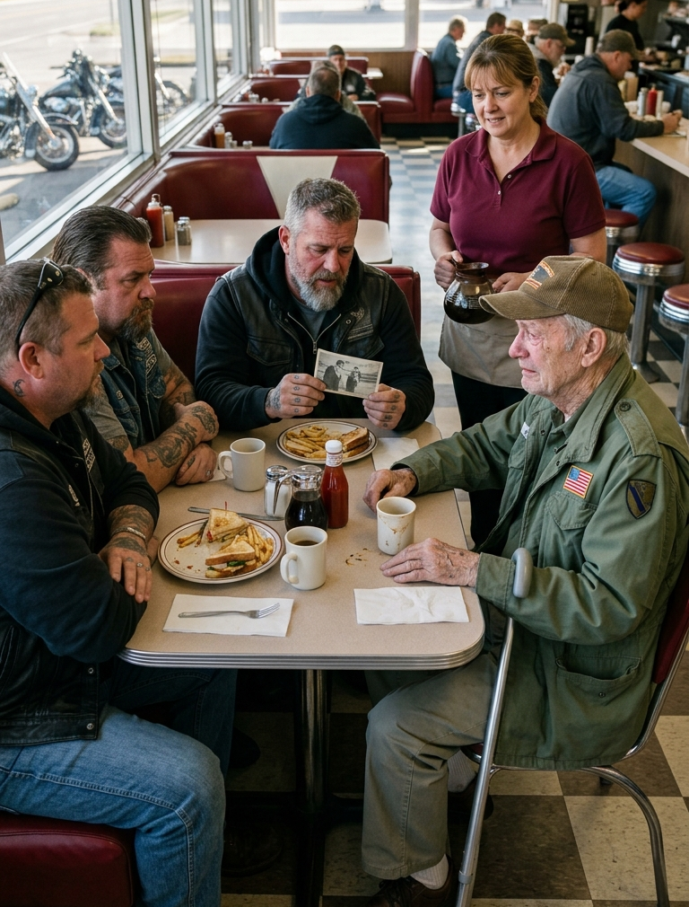 Wade stepped through the diner door with five men behind him, broad-shouldered and road-worn, each carrying the quiet presence of someone who had seen enough of life to stop trying to impress anybody. Their boots thudded against the old tile floor. A few people glanced up and then quickly looked away.