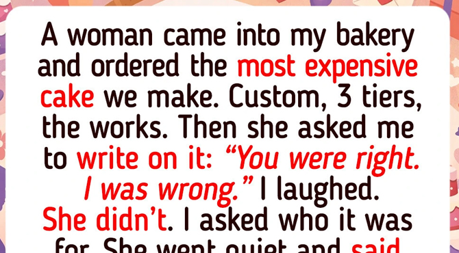 A woman came into my bakery and ordered the most expensive cake we make. Custom, three tiers, the works. Then she asked me to write on it: “You were right. I was wrong.” I laughed. She didn’t. I asked who it was for. She went quiet and said, “My daughter. She told me my husband was cheating. I didn’t believe her. I chose him over her.” My hands stopped. Then she added, “Write underneath: ‘Come home. He’s gone.” She’d kicked her husband out that morning after finding proof her daughter had been right all along. She hadn’t spoken to her daughter in 2 years. I boxed the cake for free.