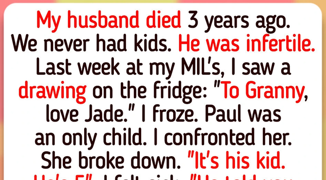 My husband Paul died 3 years ago. We never had kids because he was sterile; he was my world. Last week at my MIL’s, I saw a drawing on the fridge: “To Granny, love Jade.” My blood froze. Paul was an only child. I confronted her, shaking. She broke down. “It’s his kid, Sarah. He’s 5.” I felt sick. “He told you he was sterile because he was terrified you’d leave him,” she whispered. The door opened, and a boy with Paul’s exact eyes walked in. I braced for a fight with a mistress, but the woman with him just handed me a legal file. Paul hadn’t cheated. He had secretly adopted this boy from the foster system years ago, paying every cent he had to give him a home, naming me as the legal guardian if anything happened. He didn’t leave me a betrayal; he left me the son I always prayed for.