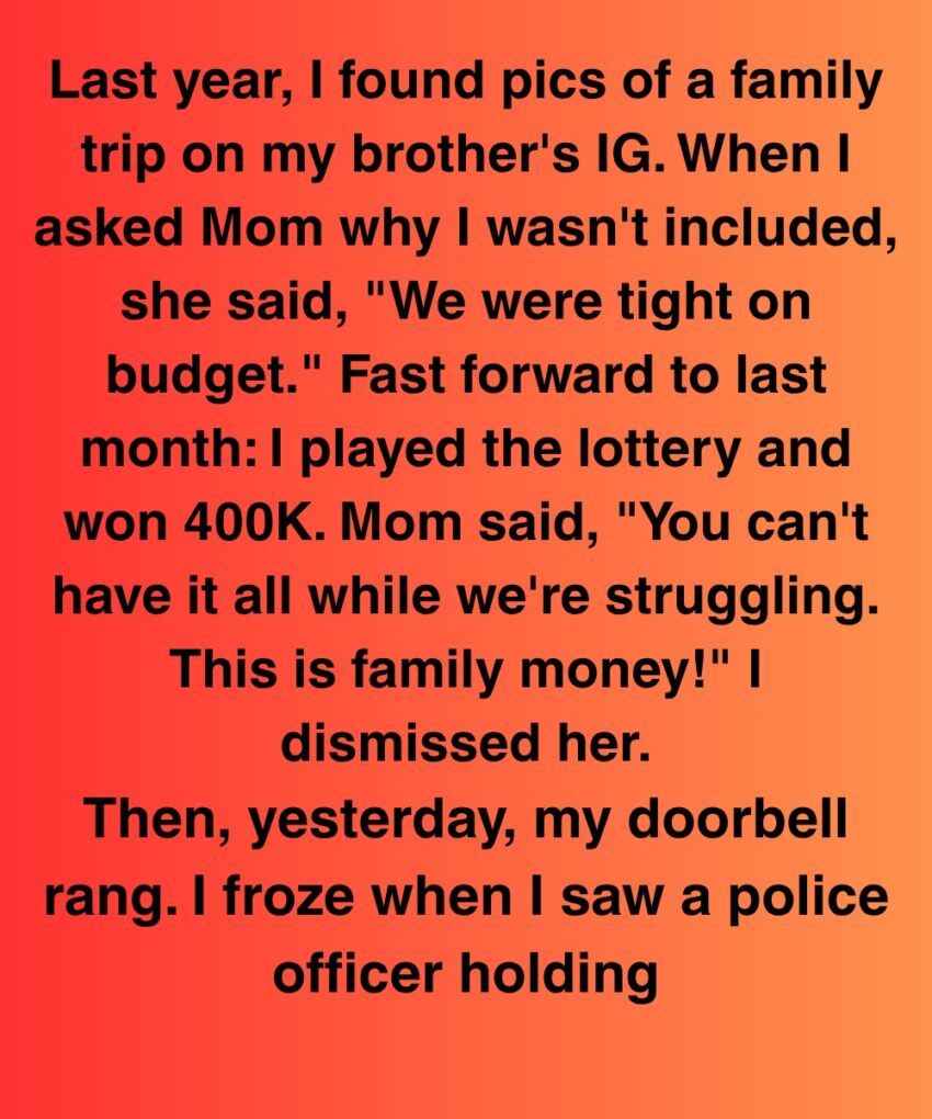 Last year, I saw my family’s Mussoorie trip on my brother’s Instagram, excluding me. Mom claimed it was due to budget issues. Then, I won $400K in the lottery. Mom demanded it as “family money,” listing expenses like Dad’s dental work and Dhaval’s loan. I refused, needing time. Yesterday, a police officer arrived, citing a complaint about “financial misconduct.” Mom falsely claimed I used her joint account to buy the ticket. I cleared it with bank statements at the station. Dad later called, saying Mom’s religious group pushed her “family karma” claim. I hired