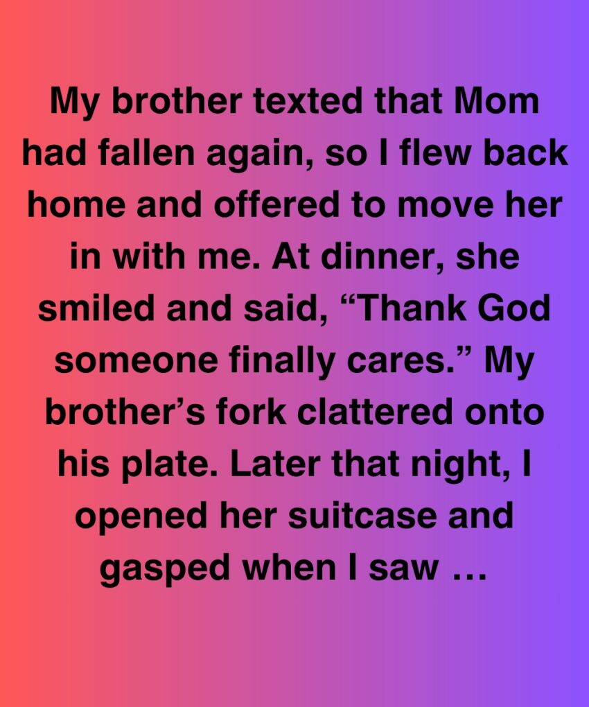 My brother Marcus texted that Mom fell again, so I flew home and offered to move her in with me. At dinner, she said, “Thank God someone cares,” making Marcus flinch. Later, I found her suitcase with her house keys, a jewelry box, and an envelope: “DO NOT TRUST MARCUS.” Inside, Mom’s note revealed Marcus stole thousands, likely gambling again. She’d kept silent because he was her son. When confronted, Marcus admitted taking money for a failed “business” and even pawned Mom’s wedding ring. I retrieved it from the pawn shop, returning it without telling her. Mom found it and cried, grateful.
