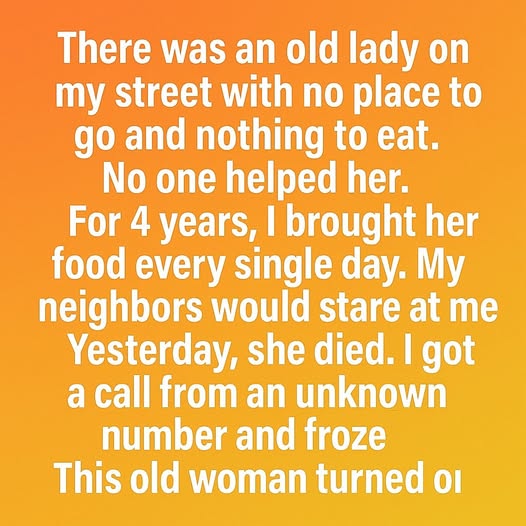 On Maple Street, an old woman lived unnoticed, a forgotten soul with no family or home. Each day, she sat on the curb, her eyes heavy with years and hunger. Passersby ignored her, but her loneliness struck me, an ordinary neighbor. I began bringing her food—leftovers at first, then meals made just for her. For four years, I delivered a plate daily, despite neighbors’ puzzled whispers, seeing her as a test of humanity: how we treat those who offer nothing in return.