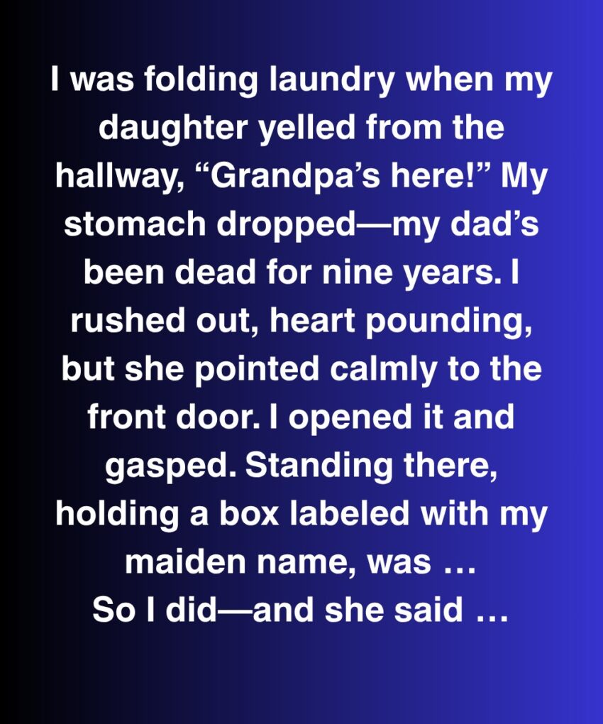 When my daughter Bella shouted, “Grandpa’s here!” my heart sank—my dad, Paul, died nine years ago. At the door stood Mark, a man who looked eerily like him, holding a box labeled with my maiden name. He worked for a clean-out crew, delivering personal items from a sold storage unit. The box belonged to my late mom, Eliza. Bella, six, insisted Mark resembled Grandpa.