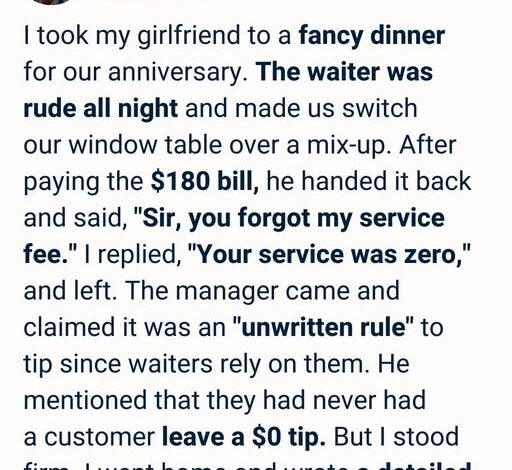 When the bill arrived, I paid $180 and even considered tipping despite everything. Then the waiter returned: “You forgot my service fee.”