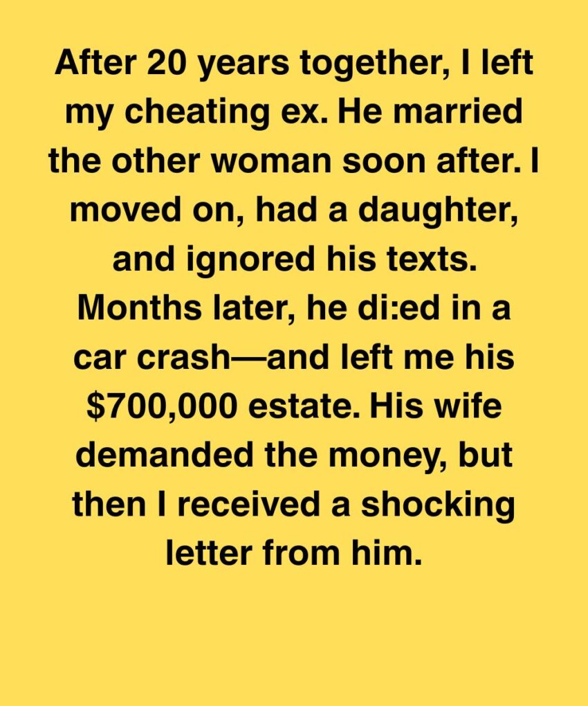 After 20 years, I left my cheating ex, Ziven, who married Thalia. I had a daughter, Elowen, and ignored his texts. Months later, he died in a car crash, leaving me his $700,000 estate. His letter apologized for his betrayal, admitting he still loved me and willed me the money as atonement. Thalia, furious, demanded the estate, claiming I didn’t deserve it. She sued, alleging manipulation. Exhausted, I doubted keeping the money, but Ziven’s half-brother, Oren, revealed Ziven’s regret and misery with Thalia, testifying to support the will. The court