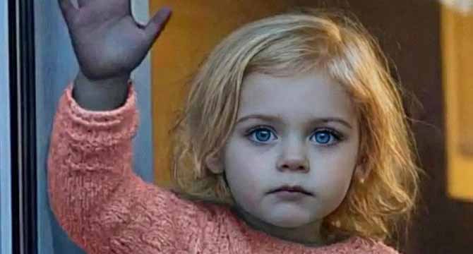 A little girl, standing at the window of a pale blue, two-story house.