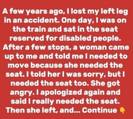 The girl shared her experience: “I lost my left leg in an accident and use a prosthetic. While I can walk and run, balancing on a moving train is hard. I was sitting in a reserved seat when the woman told me to move. I explained I needed the seat, but she got upset, called the conductor, and insisted I leave. Tired of arguing, I rolled up my pant leg, showed my prosthetic, and refused to move. She turned red and got off at the next station.”