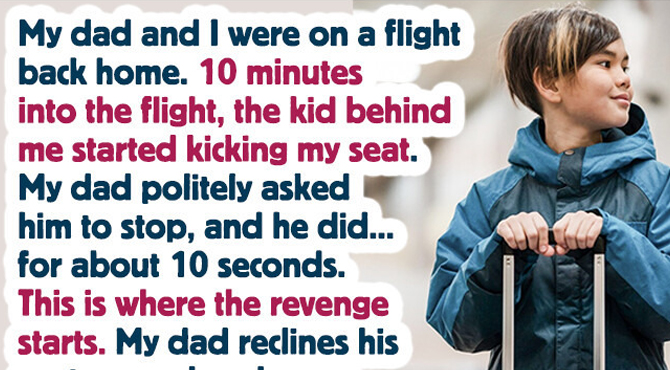 My dad and I were on a flight back home from India. Behind us was a family of three, with their son behind me and her mum behind my dad. It was a nighttime flight, and everyone was beat. It was also a small, budget airline with not much legroom. About 10 minutes into the flight, the kid behind me started kicking my seat.