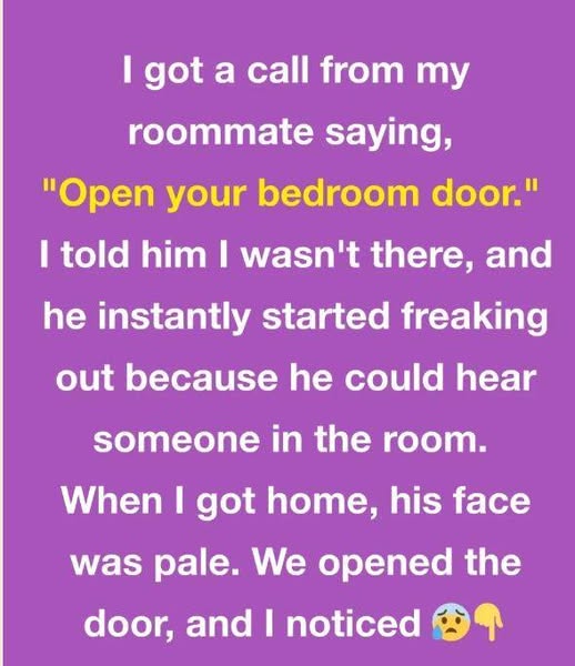 I got a call from my roommate, his voice urgent: “Open your bedroom door.” Confused, I explained I wasn’t home. His panic escalated as he swore he heard someone moving inside. Heart pounding, I rushed back. When I arrived, his face was ashen, eyes wide with fear. Together, we approached my room. The air felt thick as we turned the knob. The door creaked open, revealing an eerie stillness. At first, nothing seemed amiss—until I noticed it. My desk chair was slightly askew, papers scattered as if someone had rifled through them. A cold draft brushed