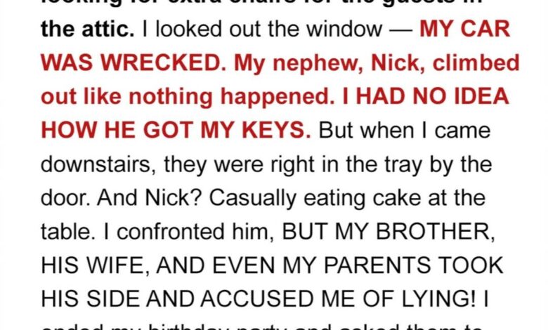 When I came downstairs and saw the damage, my heart sank. I confronted Nick, but he denied everything. Flat-out lied to my face. I looked to my family for support—surely, surely they would believe me. But instead, they circled around him like he was some fragile thing, a boy who needed to be protected at all costs. “You must be mistaken,” they said. “Maybe someone else took the car. Nick’s been here the whole time.”MI couldn’t believe it. They gaslit me in my own home.I felt rage, betrayal, heartbreak—but mostly, I felt like a fool. A fool for thinking, even for a second, that they would stand with me. So I told them all to leave. I didn’t scream.
