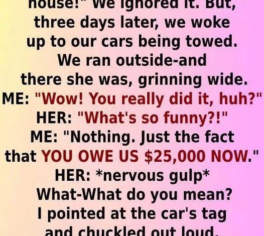 Our neighbor stuck a note on our car: “One car per house!” We ignored it. But, three days later, we woke up to our cars being towed. We ran outside—and there she was, grinning wide.