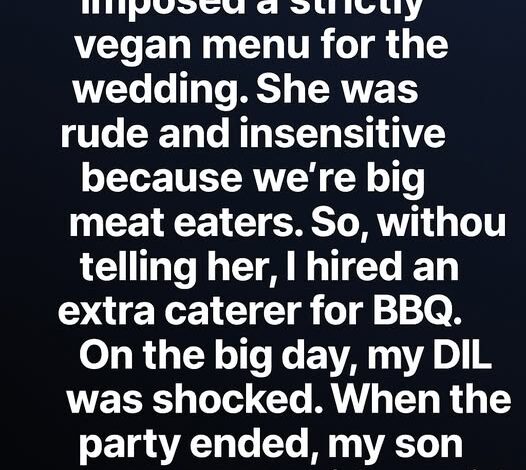 My son’s bride insisted on a strictly vegan wedding menu, reflecting her passionate lifestyle. While I respected her choice, it sidelined my barbecue-loving family, making our traditions feel ignored. Without telling anyone, I hired a caterer to set up a discreet barbecue station outside the main hall, ensuring everyone felt included without overshadowing her vegan feast.